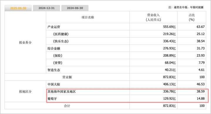 ▲复星国际业务收入结构(2025H1),来源:公司财报,同花顺